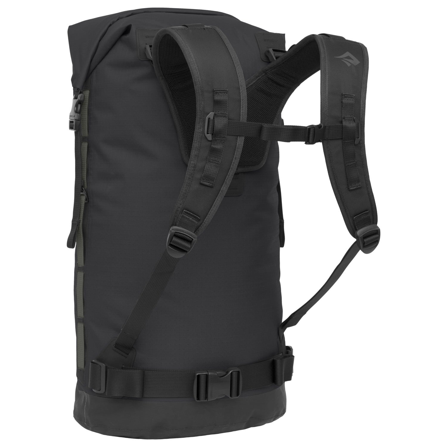 The adjustable straps comfortably secure around the shoulders, sternum, and waist, ensuring a stable fit. The white interior laminate enhances visibility, while the lash loops enable secure stacking or attachment to watercraft, motorcycles, and other gear. The hypalon non-wicking roll-top closure effectively prevents water ingress, and the Field Repair Buckles can be swiftly replaced using only a Philips screwdriver. Additionally, the oval base is designed to optimise packing space and prevent the bag from rolling away.