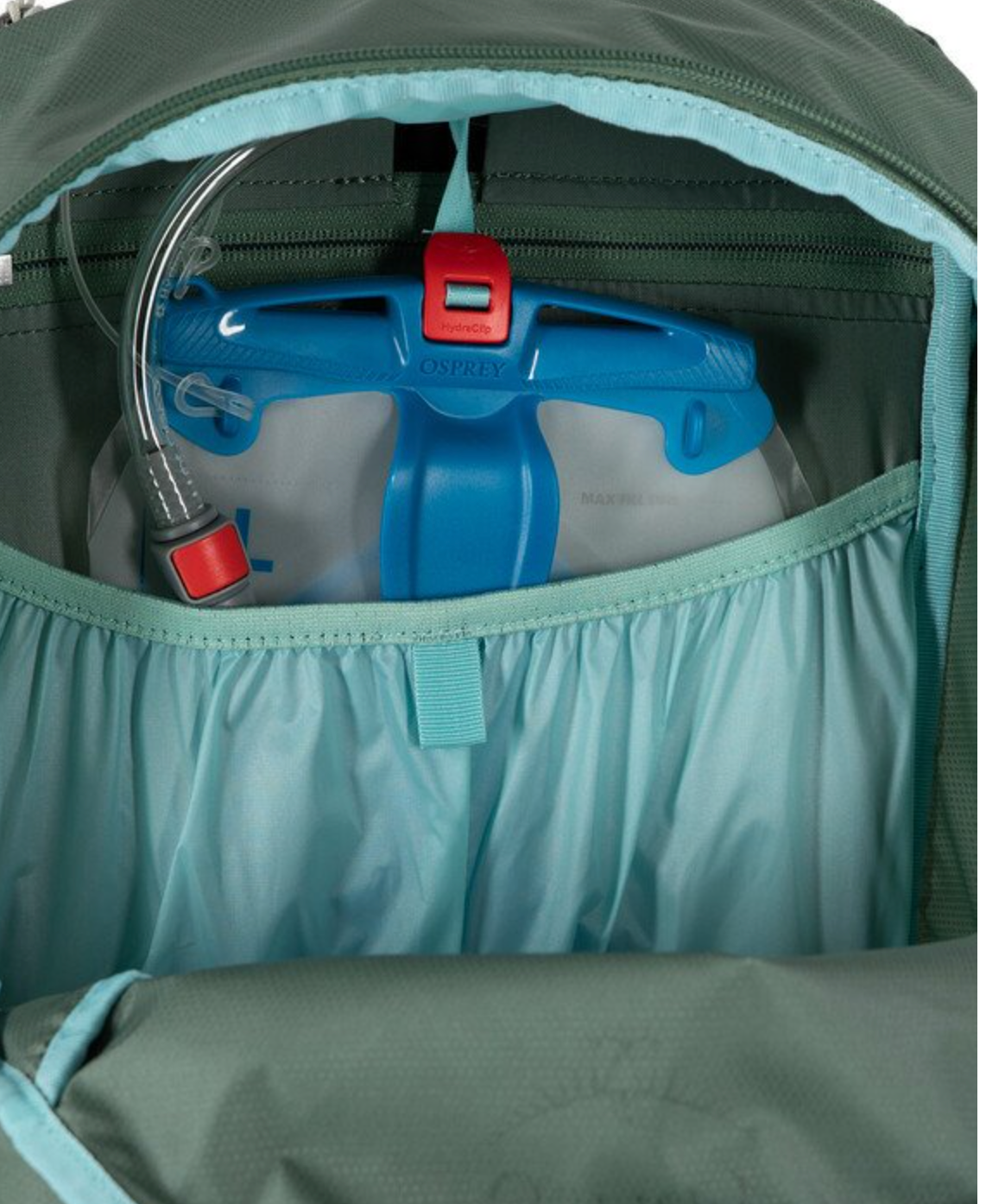 - Internal reservoir sleeve with hose port and Osprey Hydraclip for easy reservoir hanging