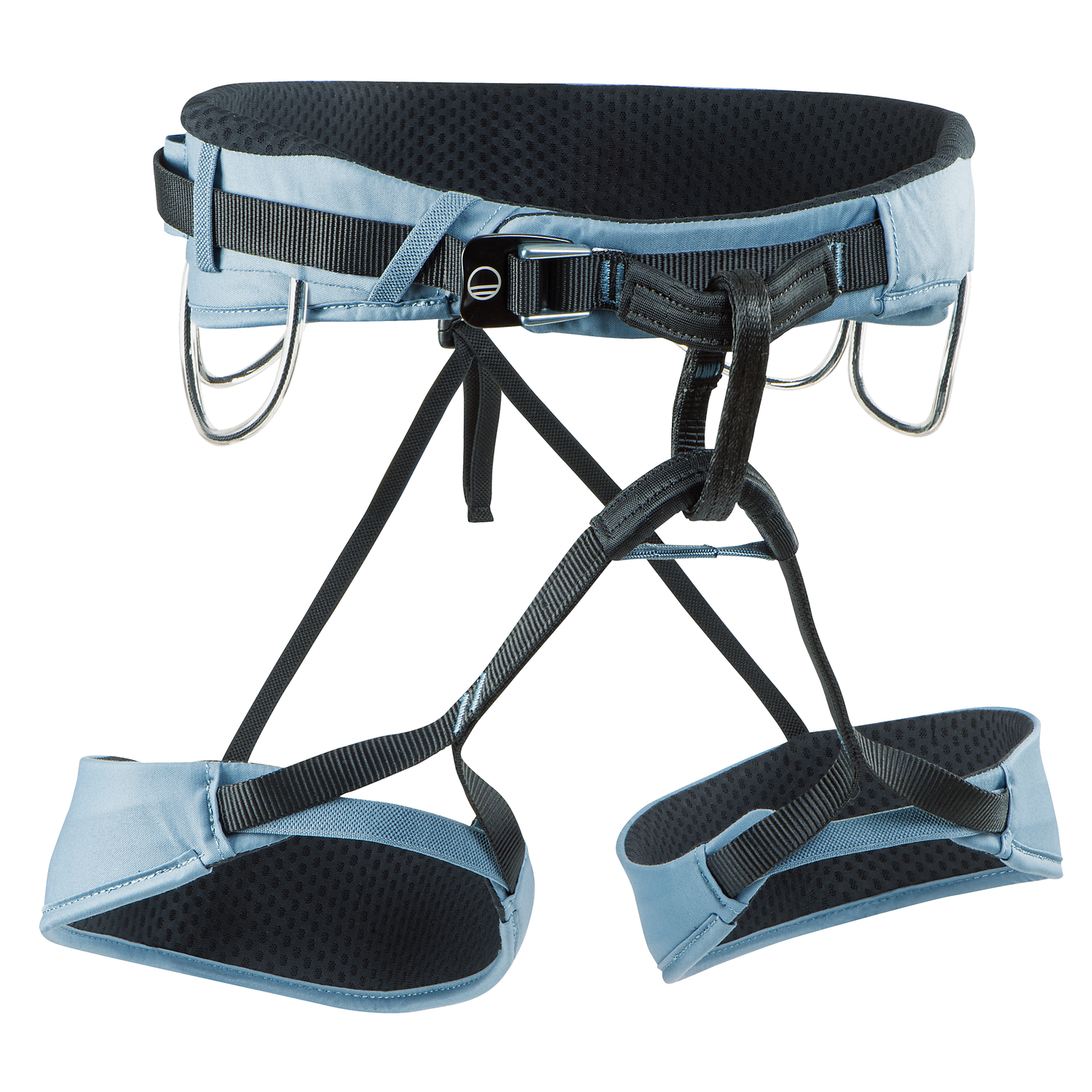 The harness features a waistbelt designed to evenly distribute the load across the lower back, reducing pressure points. Its soft webbing and breathable padding are lined with a comfortable inner mesh fabric. A pre-threaded, smooth-operating adjustable buckle helps eliminate tying-in errors. The fixed leg loops and reinforced lower tie-in point with an integrated wear indicator provide added safety.