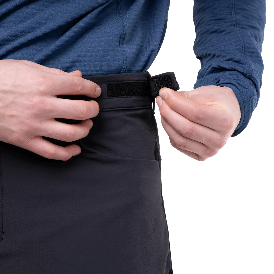 - Adjustable waistband with metal button closure sits neatly under pack or climbing harness