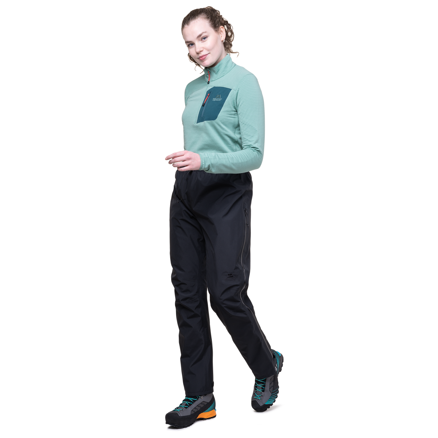Articulated knees and a gusseted crotch allow free movement, while reinforced knees and seat add durability for tougher climbs. Two-way ¾ length side zips with internal storm flaps make it easy to pull on over boots or crampons, offering quick protection and ventilation when needed. Adjustable hems ensure a snug fit around boots, keeping water out in wet or snowy conditions.