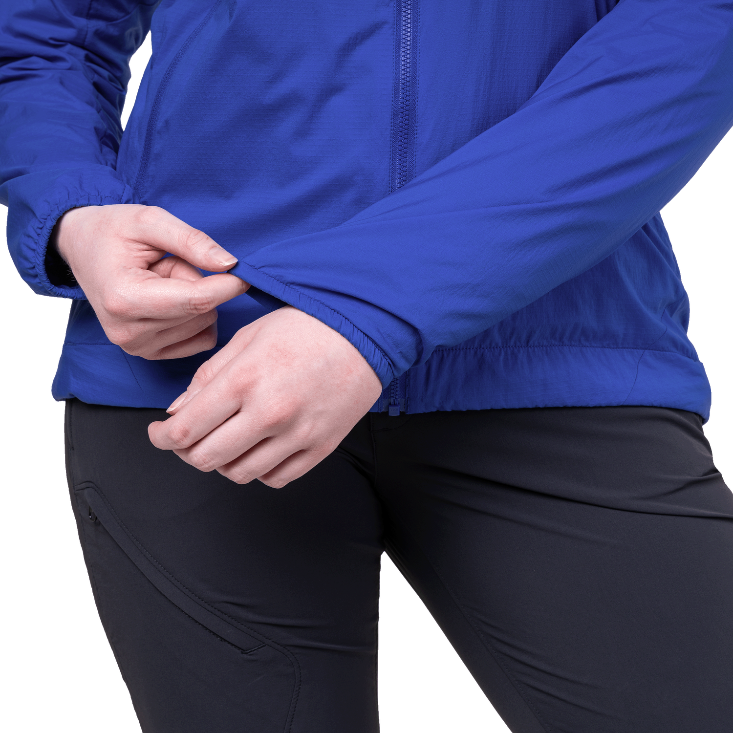 Tailored with a close-fitting Active silhouette to reduce bulk, the Aerotherm fits neatly beneath a waterproof shell when the weather turns. The hem can be adjusted via a drawcord to refine the fit, and low-profile elastane-bound cuffs help to seal out wind. A Mountain Hood with elastic binding delivers dependable protection during windy runs, yet stows neatly away when not needed. The inner lining is reversed in the arms to avoid snagging when worn with other layers, while the articulated sleeves allow for freedom of movement during climbs or scrambles. Two zipped hand pockets and a zipped chest pocket provide space for essentials, and the jacket packs into its own hand pocket with twin loops for clipping to a harness or rucksack.