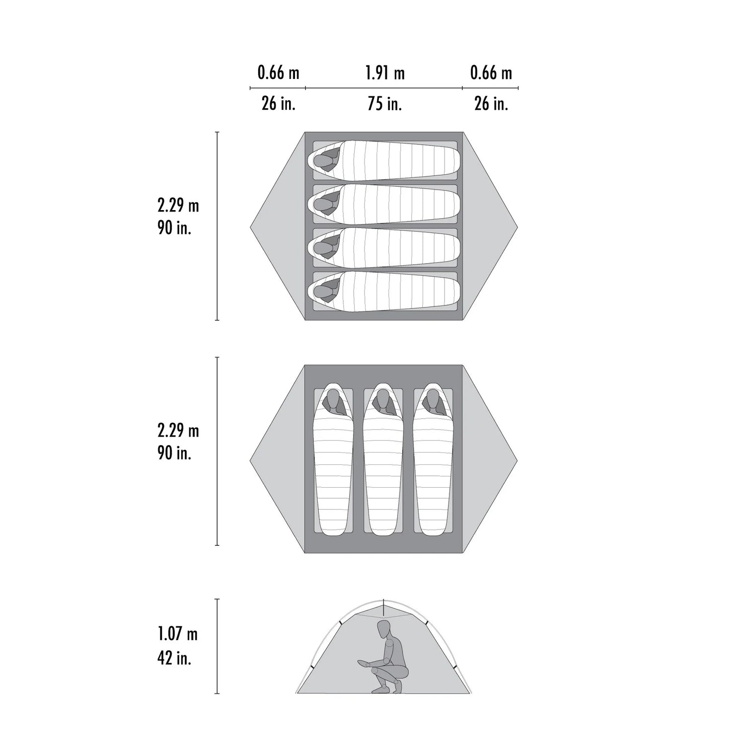 The Inside: The interior is a grand 4.35 sq. m (47 sq. ft) with no taper to accommodate modern rectangular sleeping pads. The tent body is mostly solution-dyed micromesh for exceptional breathability and bug protection, perfect for star-gazing on clear nights. No-curve tent doors feature cable ports at the corners for headphones and charging cords. Large overhead gear loft pockets are perfect for headlamps, sunglasses and other quick-access items, and an included clothesline lets you dry out damp clothes.
