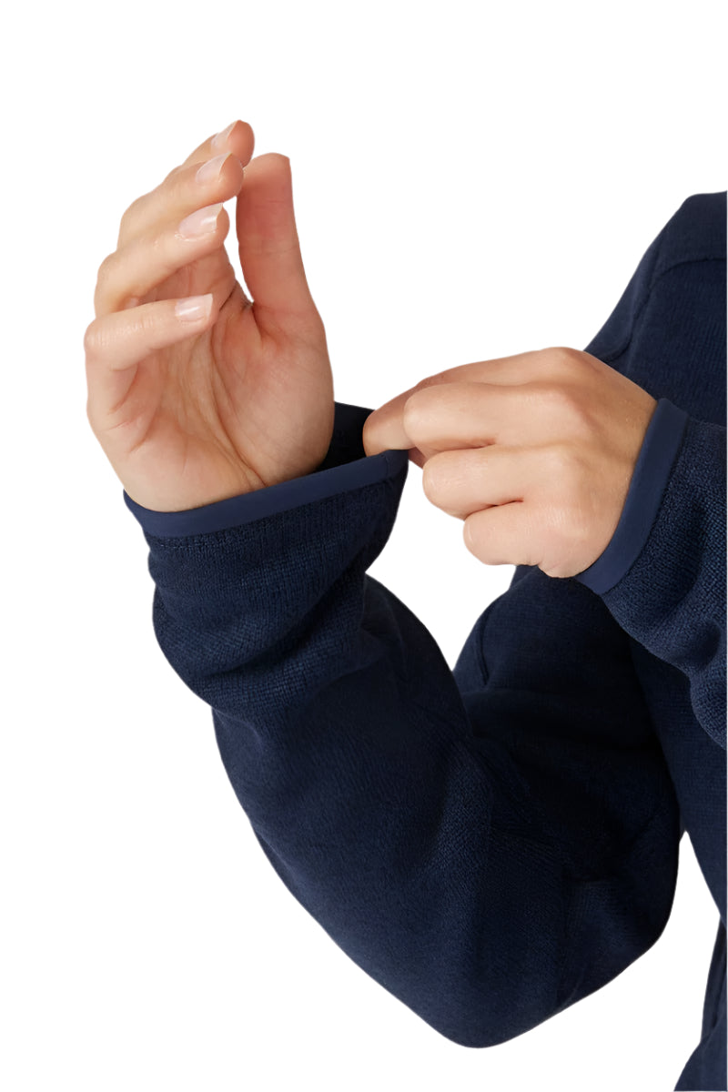 • Stretch bindings at the collar, cuffs, and hem provide a snug and cosy fit, ideal for braving the cold.