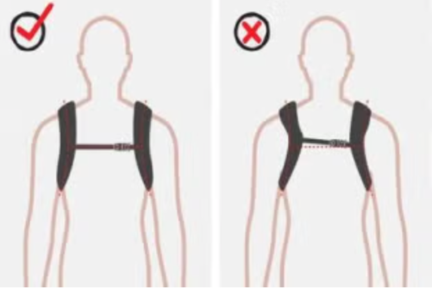 This strap buckles directly over your heart to keep the shoulder straps in place. This strap should not distort the shape of the shoulder strap or inhibit your breathing.