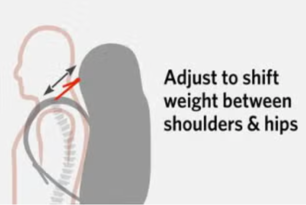 These critical straps allow you to shift weight between your shoulders and hips. They also draw weight toward your centre of gravity and provide stability.