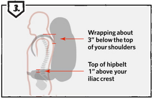 It's best to try it on with some weight in it - at least 10 to 20 pounds. Make sure the top edge of the hipbelt sits 1 inch above your hips. The shoulder straps should wrap smoothly over your shoulders, then onto your back about 3 inches below the top of your shoulders. If the shoulder straps starts lower than 3 inches, try and smaller size.