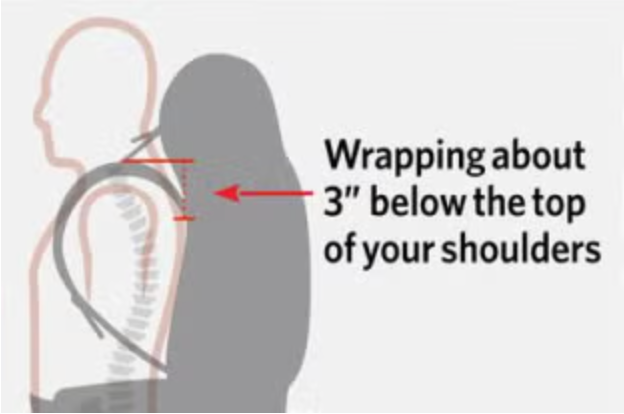 They should form to the contours of your natural shape and rest against your shoulders, wrapping about 3 inches below the top of your shoulder blade.