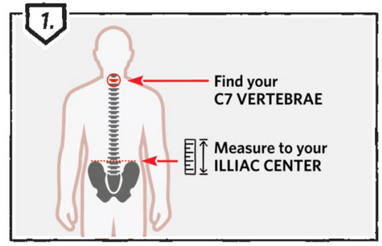 Have a friends grab a soft measuring tape. Tilt your head forward so they can find the highest protruding knob at the base of your neck - that's your C7 vertebrae. They should measure from that point down your spine until they reach your iliac centre - that's the spot that aligns with the highest point on your hipbone.