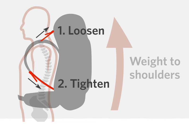 Loosen the load lifter straps, then tighten the shoulder straps.