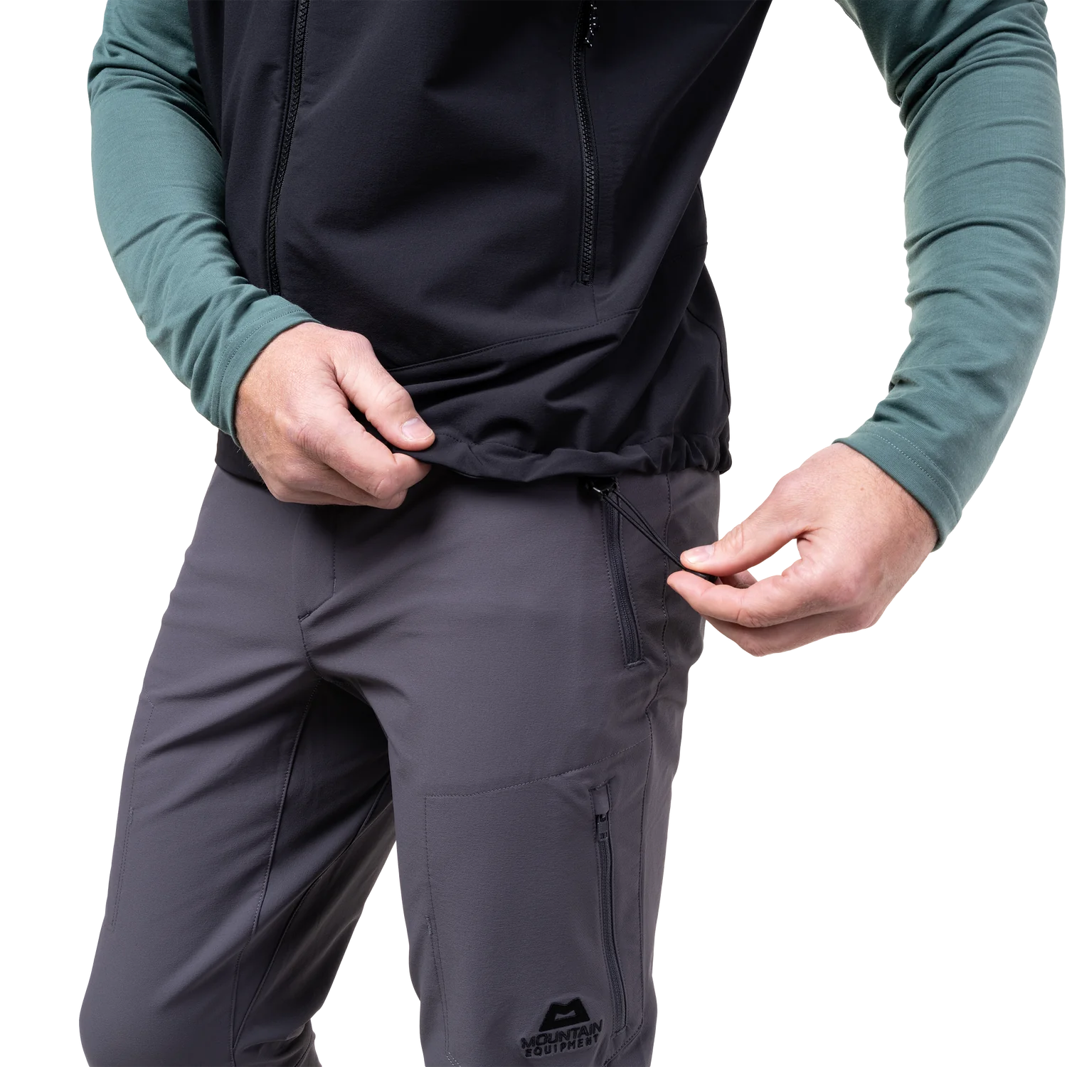 Dual tether hem drawcord detail on Mountain Equipment Frontier Men's Vest in Black