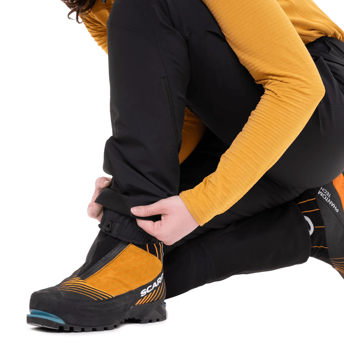 The EXOLITE XP fabric is durably weather-resistant, and key seams are taped to increase protection even further from both wind and water ingress. It's comfortable to wear either next to the skin or over a base layer in cold conditions. Zip-out internal gaiters give an extra seal whilst post-holing through fresh snow, and there are 500D polyamide reinforced kick strips to limit crampon scrapes. The adjustable waistband sits flat under a harness and provides rapid fine-tuning as you change layers after a long approach.