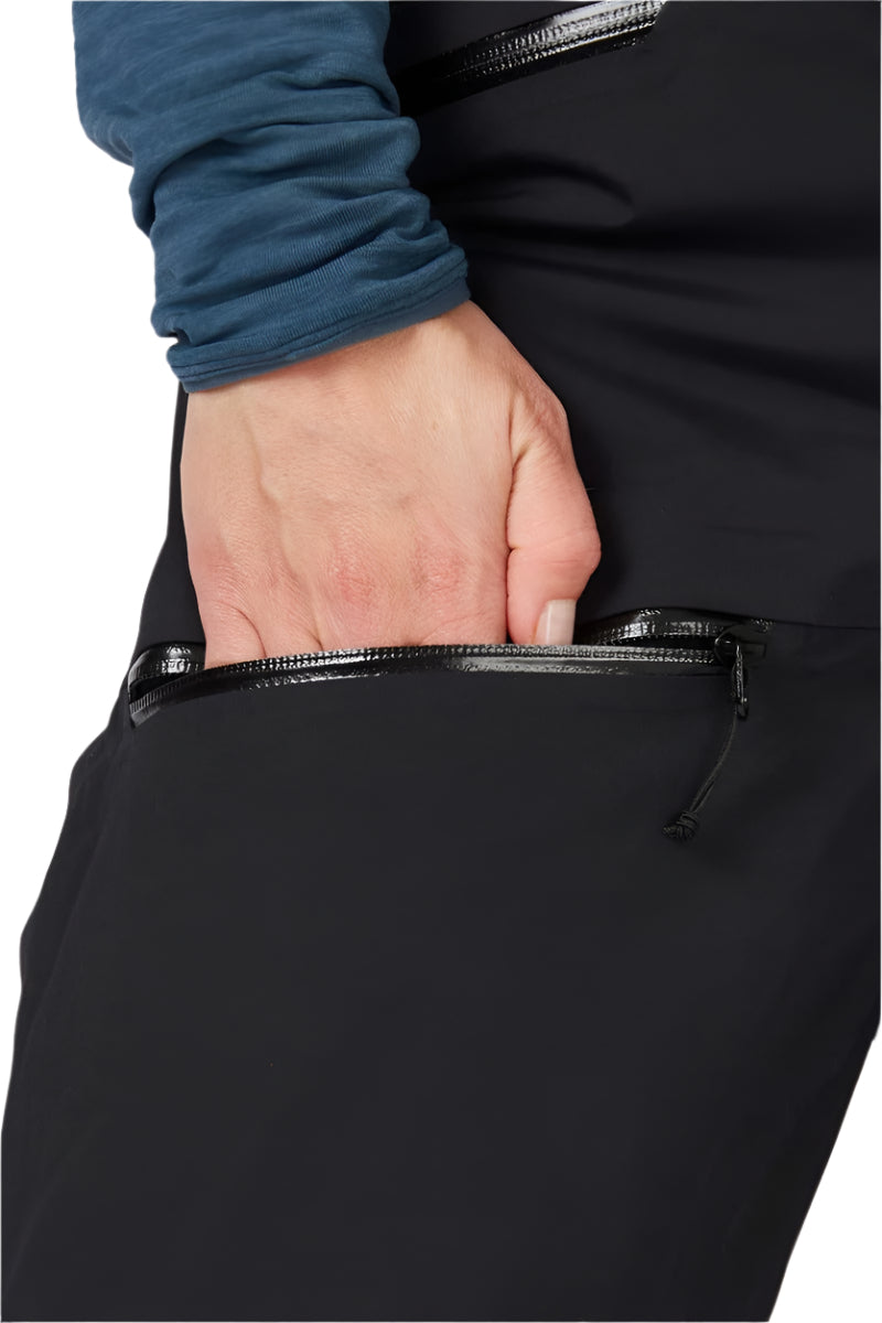 Zipped stretch gaiters and a snap closure at the hem help to keep out spindrift while allowing for quick boot adjustments. Reinforced kicker patches offer extra durability against abrasion from skis, rocks, and ice. The deep waistband is lined for comfort and can be tailored using dual hook-and-loop adjusters, or fitted with a belt or braces via integrated attachment points. Articulated knees and a diamond gusset ensure unrestricted movement, especially when climbing steep terrain. When the pace picks up, heat can be released through zipped thigh vents. Practical storage options include zipped hand pockets and a bellows-style thigh pocket with an internal clip to keep essentials like keys secure during deep powder descents.