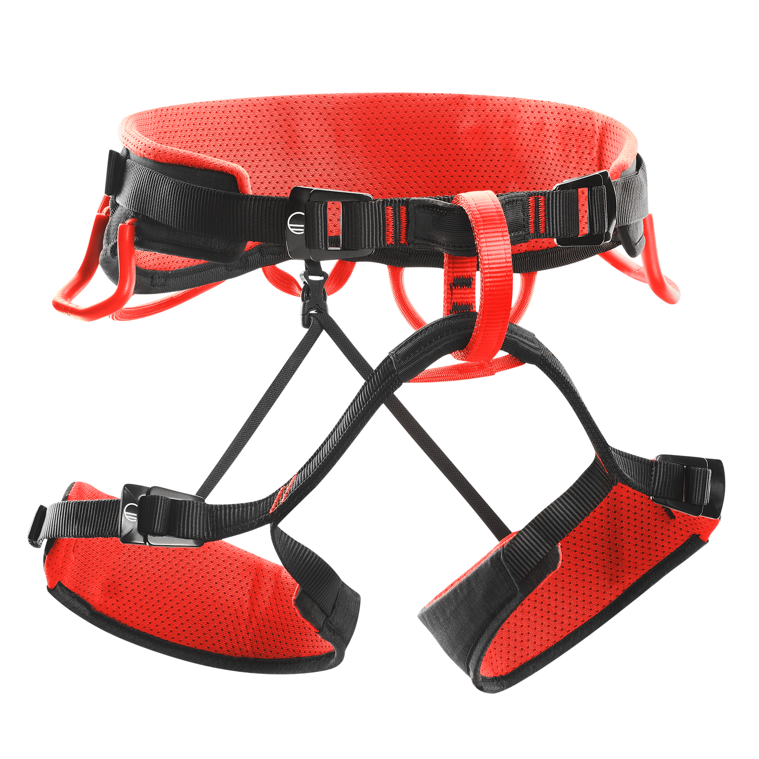 A standout safety feature is the wear indicator at the reinforced lower tie-in point. Red threads become visible after significant wear, indicating when the harness needs replacing. For added ventilation, the lumbar region features a breathable Air Mesh zone. The harness includes two slide block buckles on the waistbelt and leg loops, fully adjustable for easy wear over layers or while using crampons or skis. Elastic retainers prevent loose strap ends from getting in the way.